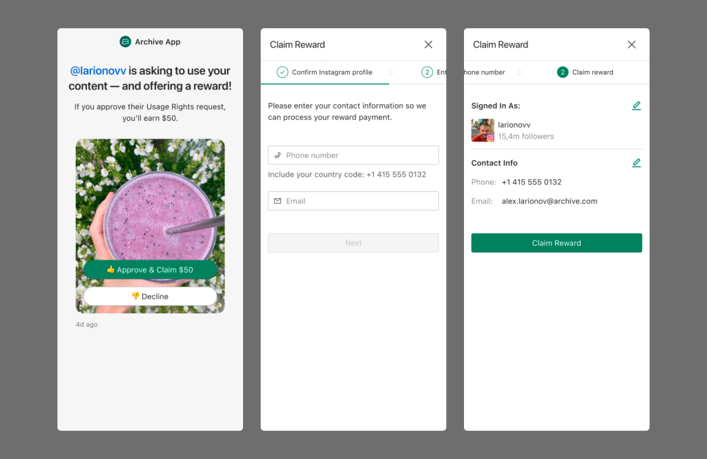 We had to tackle a separate complex project to add rewards to usage rights requests. This involved integrating platforms like Stripe and Shopify for payments, and Tremendous for sending rewards.