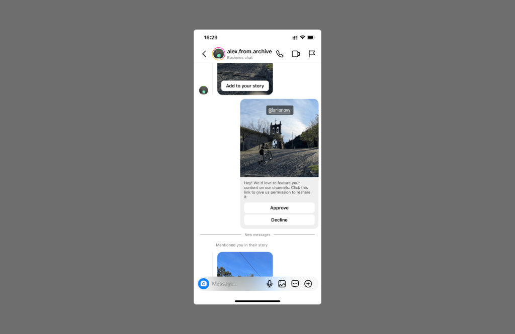 After sending the request, the influencer will get a message that looks native. They can approve the request without leaving Instagram’s DM.