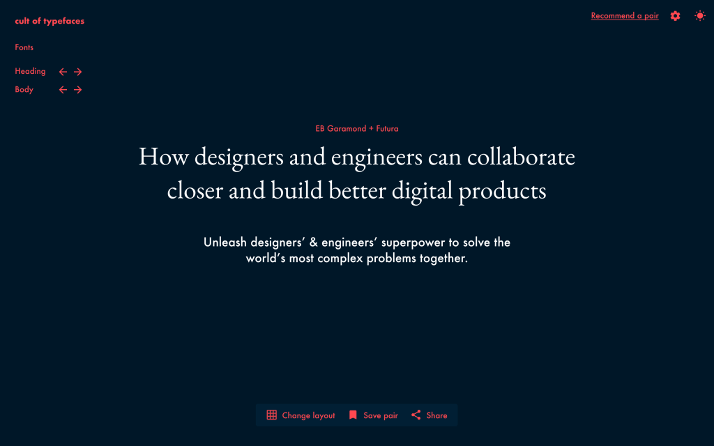 The Telegram channel displaying great design details to 30k subscribers.A simple tool for making and playing dialogue-based games.And enable users to easily share games with friends and invite them to play the creations they’ve built.A simple app to support and simplify calculations for famous table game Munchkin Quest. A tool to choose font pairings and preview them on various app and web designs.Budgeting app inspired by popular Reddit method.